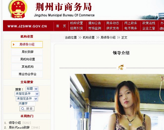12月5日上午,荆州市商务局向该市网监支队报警:称其委托某科技有限公司建设并维护的“荆州市商务局”网站被人非法入侵,首页“领导介绍”栏目中,商务局局长的照片被篡改成一张衣着暴露的“三点式”AV女郎图片,还将“局长致词”内容篡改为“为Mack的女友庆祝生日”的一段无聊话语。