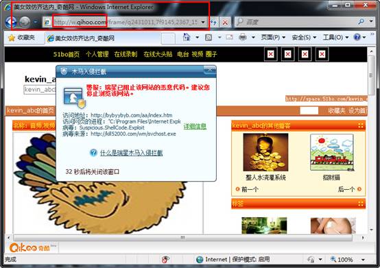 瑞星安全专家介绍,“奇虎”被挂马页面地址为w.qihoo.com/frame /q2431011,7f9145,2367_15523.html,该页面引用了一个网民的博客,黑客正是利用目前最新的微软视频漏洞进行挂马,用户一旦访问后IE浏览器会崩溃,甚至可能感染病毒。