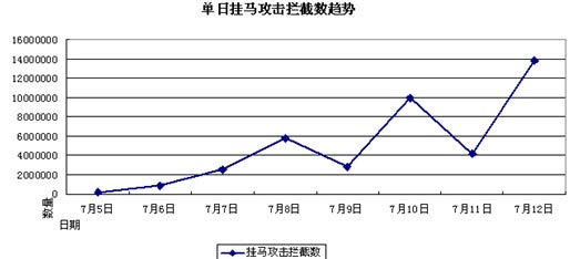 图片说明:7月4日以来针对微软视频漏洞的单日“挂马”攻击拦截量走势图
