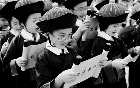 9月1日下午,一则图片新闻报道了杭州紫阳小学的新生入学仪式。这个学校已有300多年历史,从发表的3张照片看,一些小学新生穿戴着类似影视剧中的清朝衣服、帽子,手捧黄色书卷。报道称,90多名新生身穿“学士服”,参加诵读入学三字经、向师长行礼等活动。