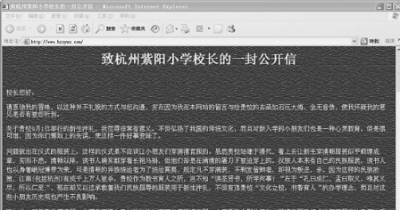 昨天下午,记者打开紫阳小学的主页,准备了解一下新生入学仪式的情况,但眼前的一幕让人大吃一惊:打开学校网址(www.hzzyxx.com)后,跳出的不是学校的主页,而是一封信。