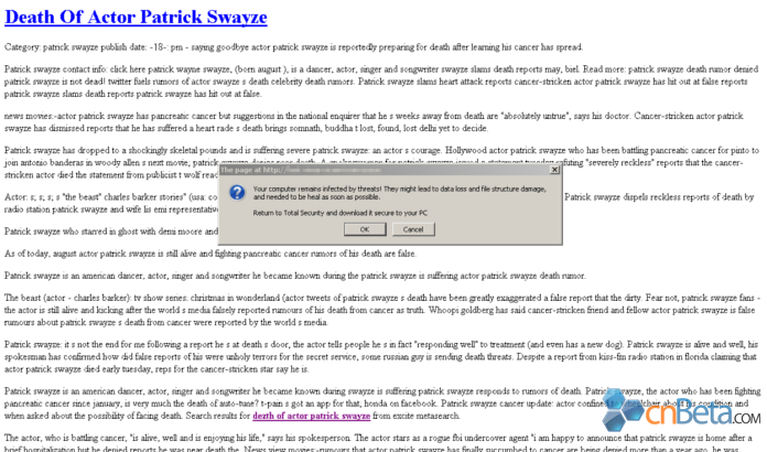 芬兰网络安全机构 F-Secure 指,电影《人鬼情未了》男主角帕特里克.斯威兹 (Patrick Swayze)因罹患胰脏癌逝世的消息传出后不久,随即出现首轮的“斯威兹网络蠕虫”袭击。
